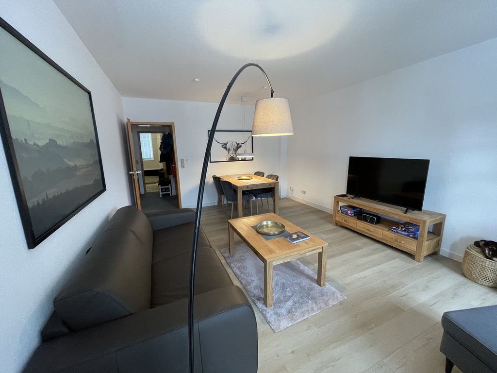Ausstattung: Komplette Einbauküche mit 5-Platten-Elektoherd, Backofen, Geschirrspüler, Mikrowelle Töpfen, Geschirr, Philips Senseo Kaffeemaschine, Kaffeemaschine mit Thermokanne, Wasserkocher und Toaster. Das Tageslicht-Bad ist mit Badewanne/Dusche und WC ausgestattet. Die Wohnung verfügt zudem über ein gemütliches Wohn-/Esszimmer, welches mit einem 32"-Flachbildschirm-TV, einer Wohnwand, einem Esstisch mit 4 Stühlen, einem Couchtisch, einer gemütlichen Couch (auch als Schlafsofa für 1 Person nutzbar) sowie verschiedene Gesellschaftsspiele und Bücher ausgestattet ist. Das Schlafzimmer ist mit einem Doppelbett, zwei Kleiderschränke und mit einem weiteren 32"-Flachbildschirm-TV eingerichtet.